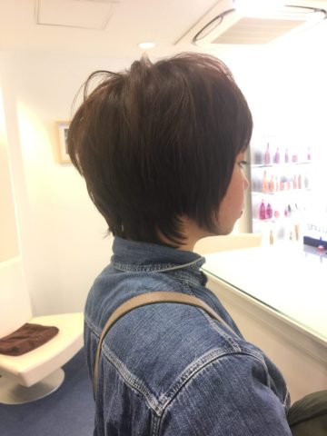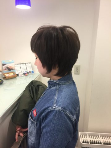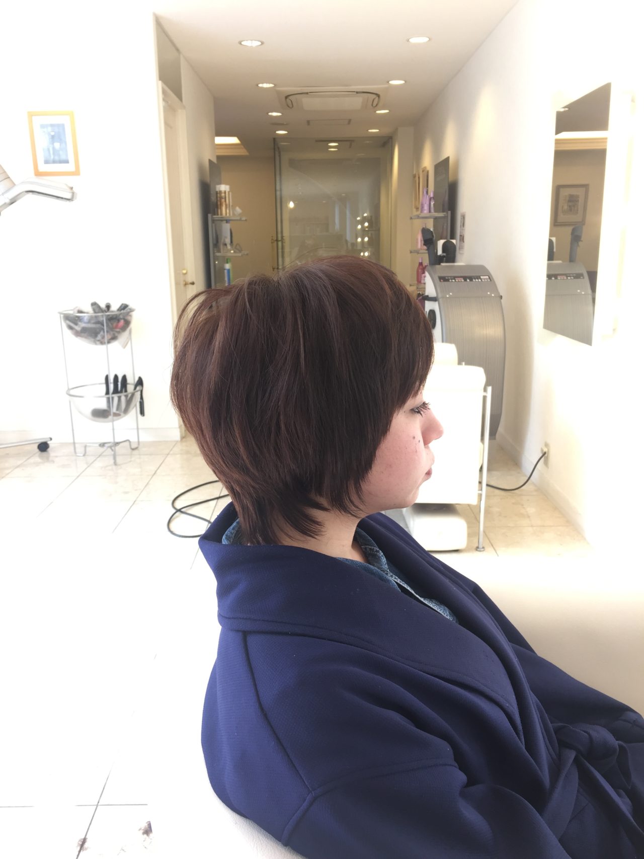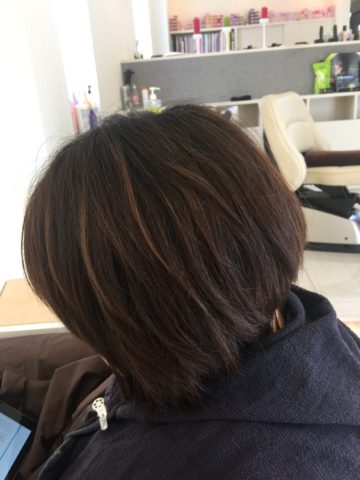 オイルグロスカラーiNOAでカラーチェンジ、デザインカットは横の丸みを無くして春らしい軽いスタイルに