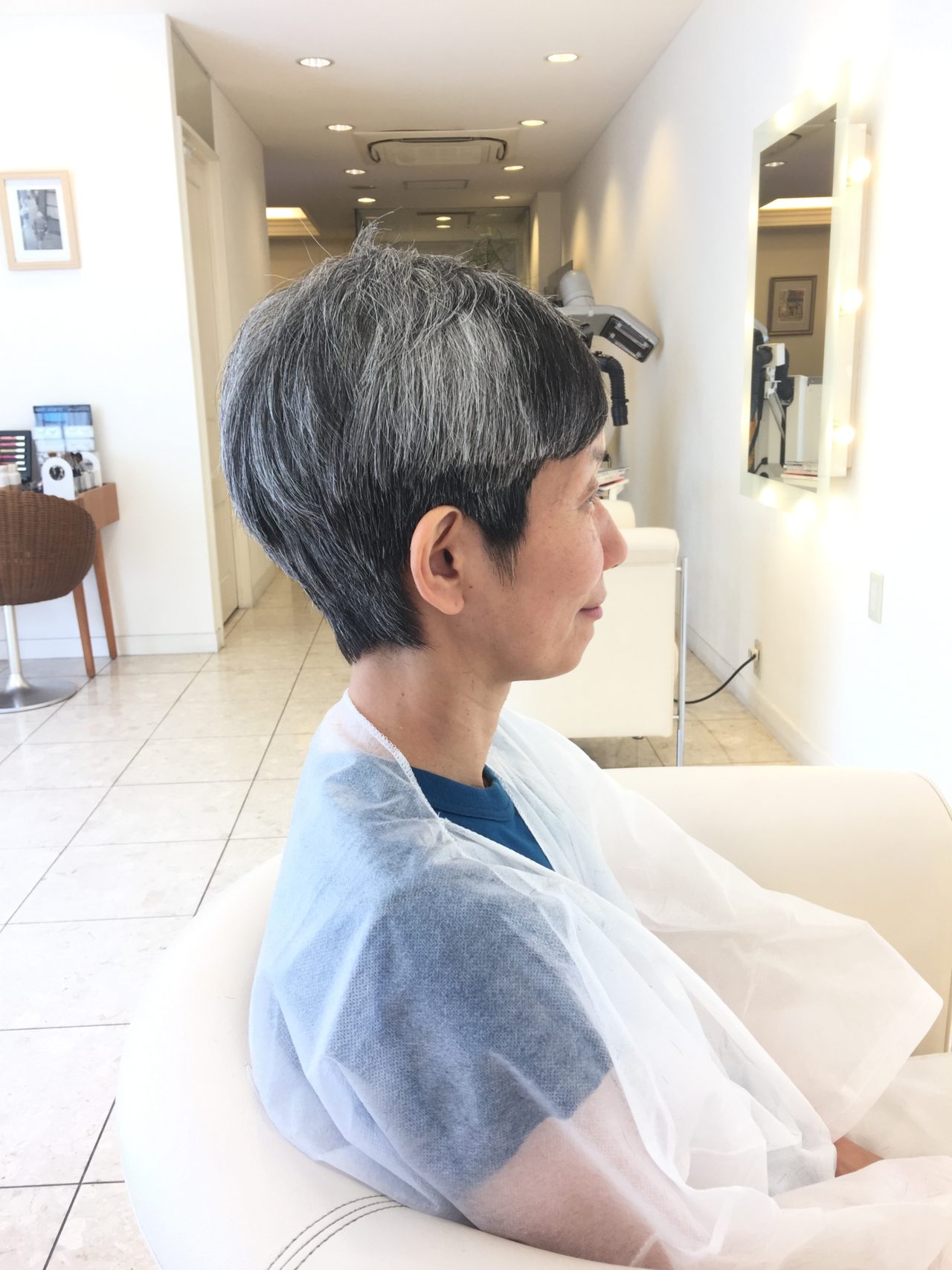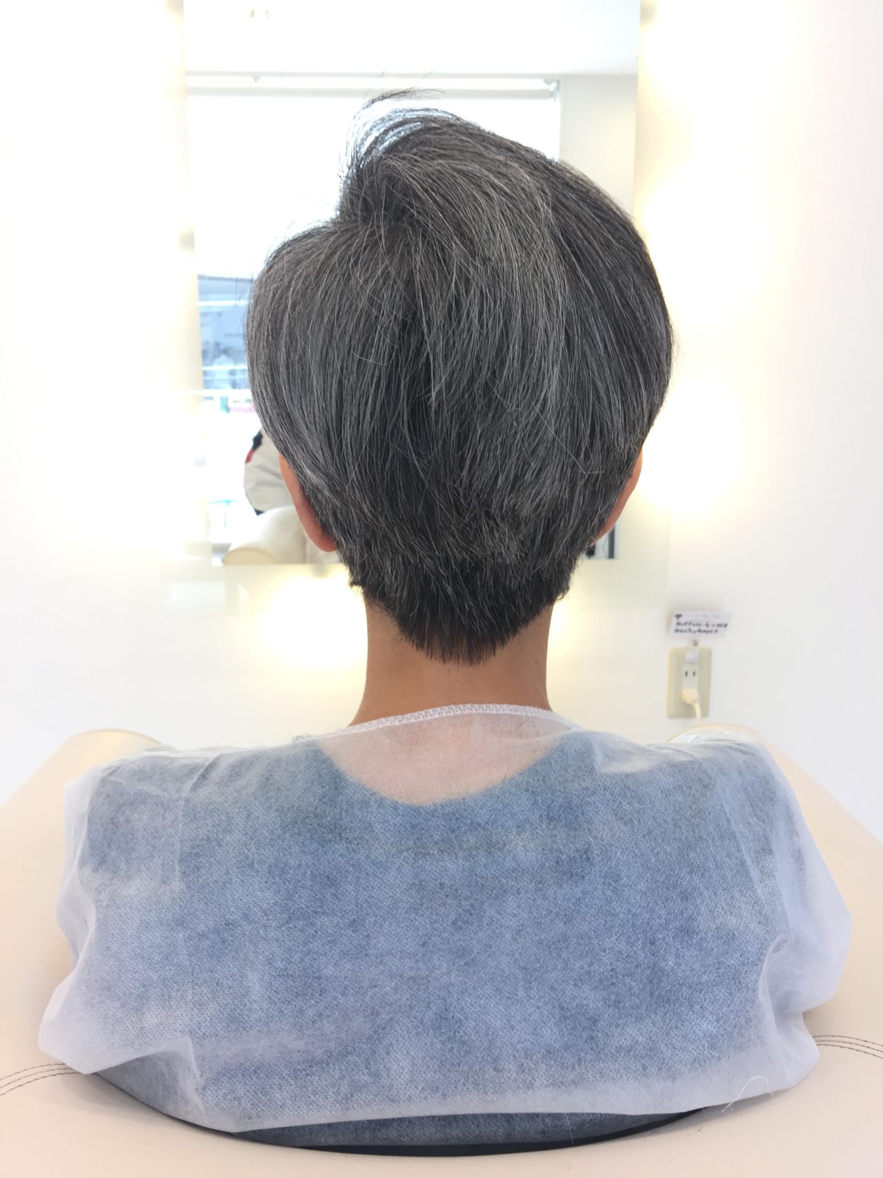 髪質が硬いのと白毛ですのですきバサミを使ってなじませを入れると収まりが悪くなりツヤがなくなるので頭の丸みに合わせたレイヤーでラウンドレイヤーテクニックを使い骨格補正と収まりメリハリ感をハサミで細かくチェクいたします