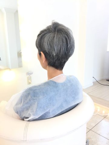 髪質が硬いのと白毛ですのですきバサミを使ってなじませを入れると収まりが悪くなりツヤがなくなるので頭の丸みに合わせたレイヤーでラウンドレイヤーテクニックを使い骨格補正と収まりメリハリ感をハサミで細かくチェクいたします