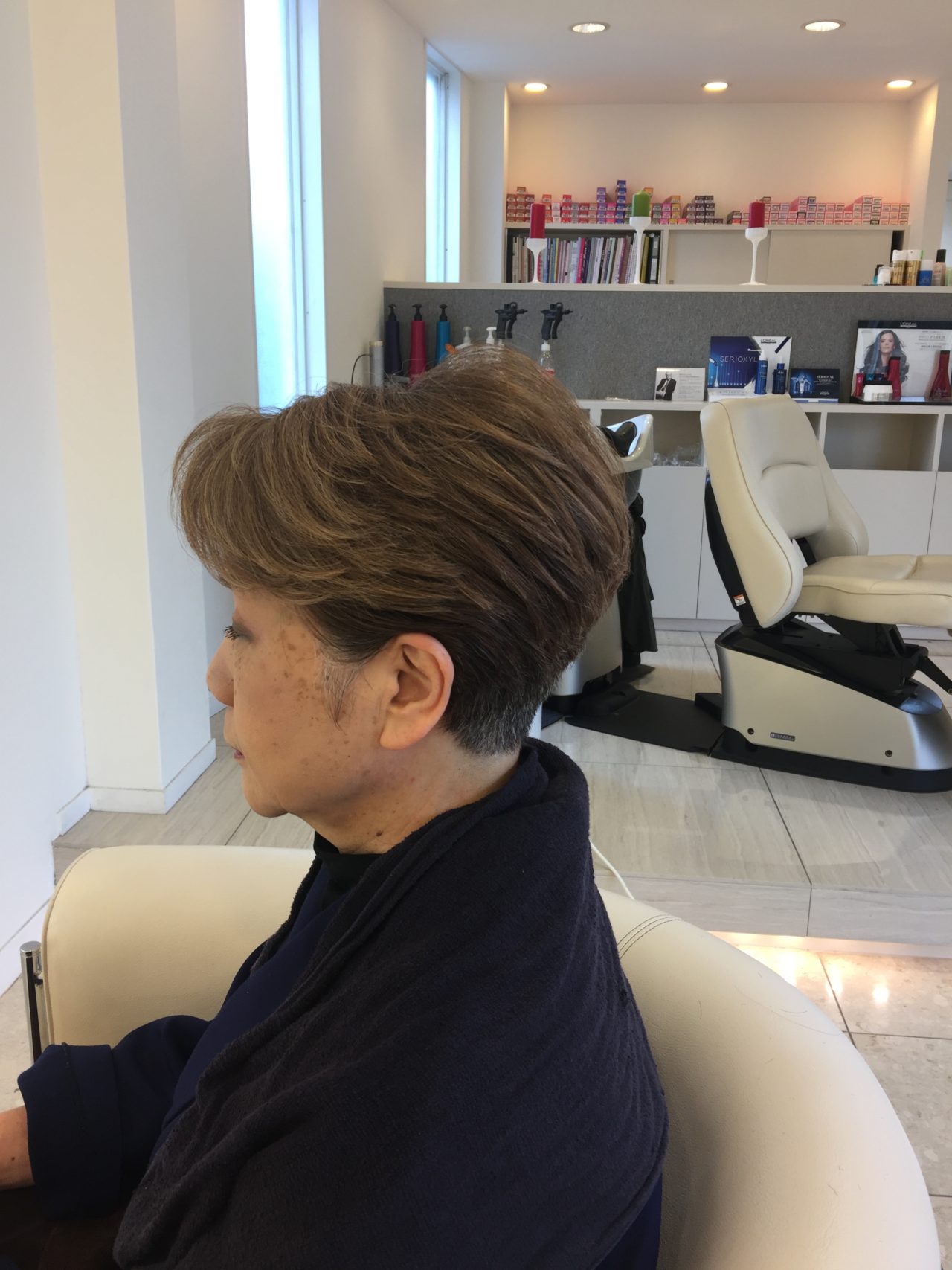 襟足を刈り上げて、スッキリさせると床屋さんでカットした感じでフェミニンでないので前髪は長めにして雰囲気を残して襟足はスッキリと刈り上げて女性らしいスッキリショートの完成です。