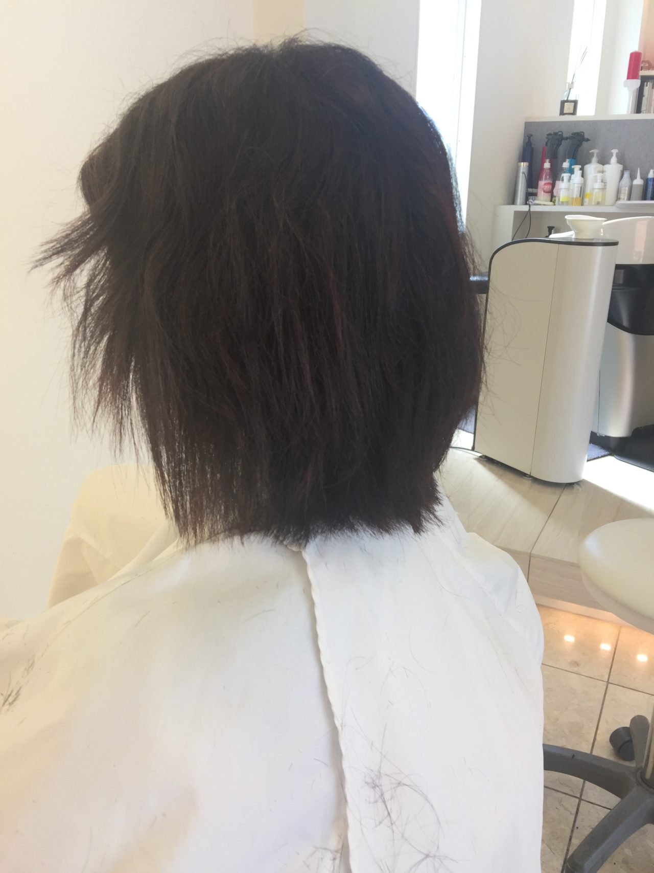 髪質は太く硬く多く癖はじゅ連毛、捻転毛の癖のタイプ、カットだけではまとまり、ボリュームのコントロールができない髪質です。