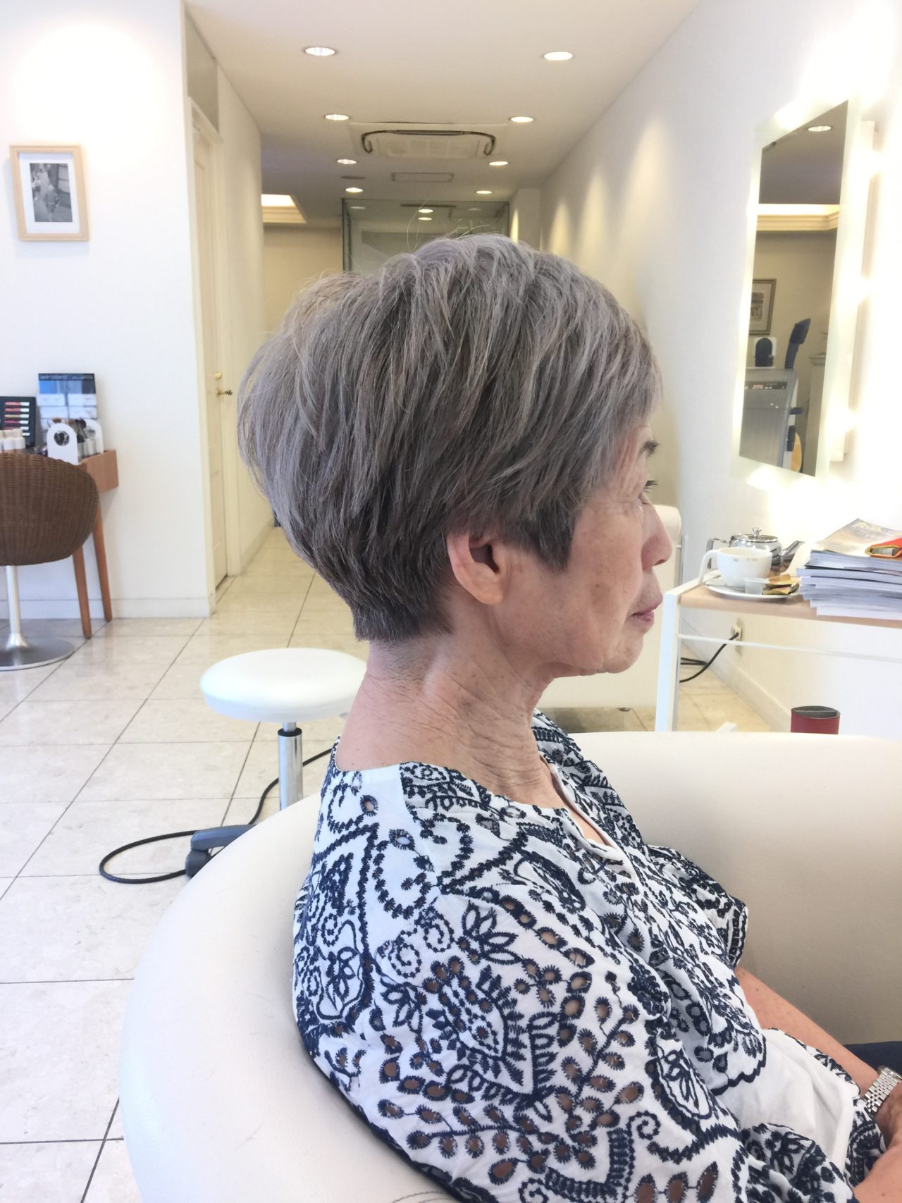 デザインカットはお顔が細いのでサイドに丸みボリュームを残したスタイルにデザイン致しました。