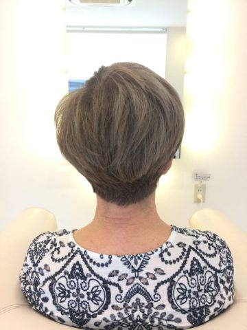 お客様的にはコロンとしたボリュームまでは欲しくないとのことでしたので再度の丸みを作るグラディションカットを入れてからトップからラウンドレイヤーのテクニックを使い丸過ぎるバランスをお顔の細さが強調されない範囲で絞ってデザイン致しました