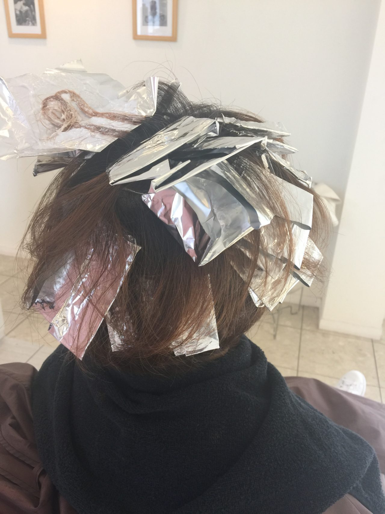 今回のカラーはボンドボリュームアップコントラストー(W)でハイライト、ローライトで立体感を作り最後はお肌に合う色のベージュにトレンドのシルバーを隠し味に入れたメタルカラーにいたしました