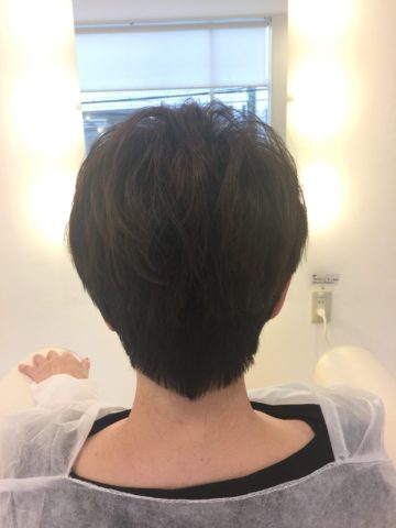 デザインカットはウエイトアップの目的と生え際周りの生えグセが強いので通常ではマッシュラインは前から切り始めるが切り口が強く出すぎることとフェイスラインの仕上がりの硬さが出る為バックから切り進めたバックグラディションのテクニックを使いデザインしました。