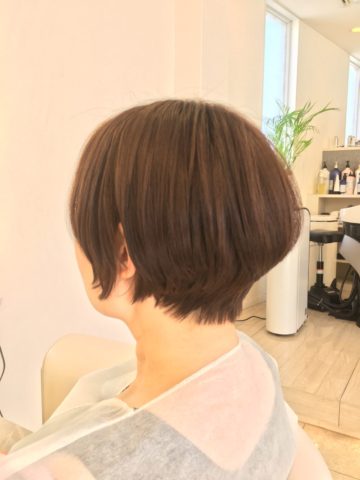 ノンジアミンカラーとファッションカラーを混ぜたハイブリットカラー。ノンジアミンでアルカリを低減し艶がアップ、ファッションカラーの鮮やかさを生かしたカラーです。伸びてきた時に黒髮が気になりにくいように暗い色(ローライト)を配したハーブカラーコントラストシングルで施術。デザインカットは秋向けに襟足を短めにして後頭部のウエイトの調整しました。