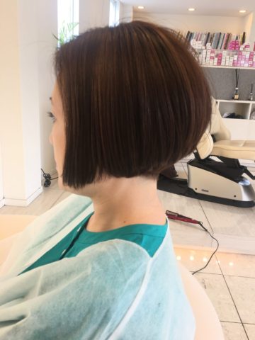 元々硬い髪のゲスト硬いなりにエイジング毛になりつつあり、髪質改善・酸熱トリートメントで柔らかさとエイジングケアーしました。ヘアーカラーは白髪ぼかしの方法を使い前回のハイライトを活かしベェージュのローライトでコントラストの調整です。ベースカラーはオリーブです。今回から質感に拘ることにしまして、滑らかな質感にするためにローライトの大きさを深さ7ミリ間隔9ミリ幅5ミリのトライアングルチップで質感カラーに!カットは襟足スッキリの目下がりの刈り上げボブです。カラーのあとは活性酸素を還元する為に水素ケアーです。